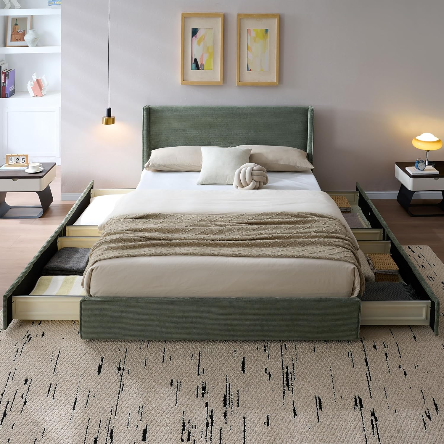 King Size Platform Bed Frame with 4 Storage Drawers, Upholstered Headboard, Wooden Slats Support, Fully Upholstered Mattress Foundation, No Box Spring Needed, Easy Assembly, Black
