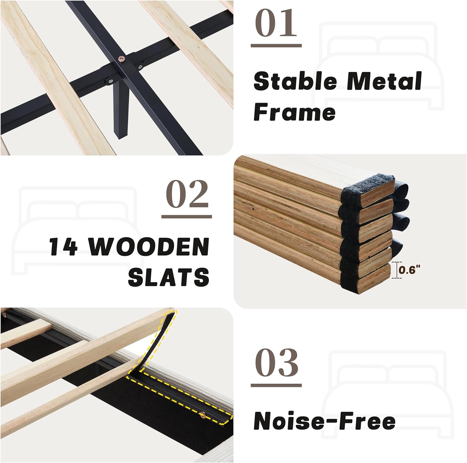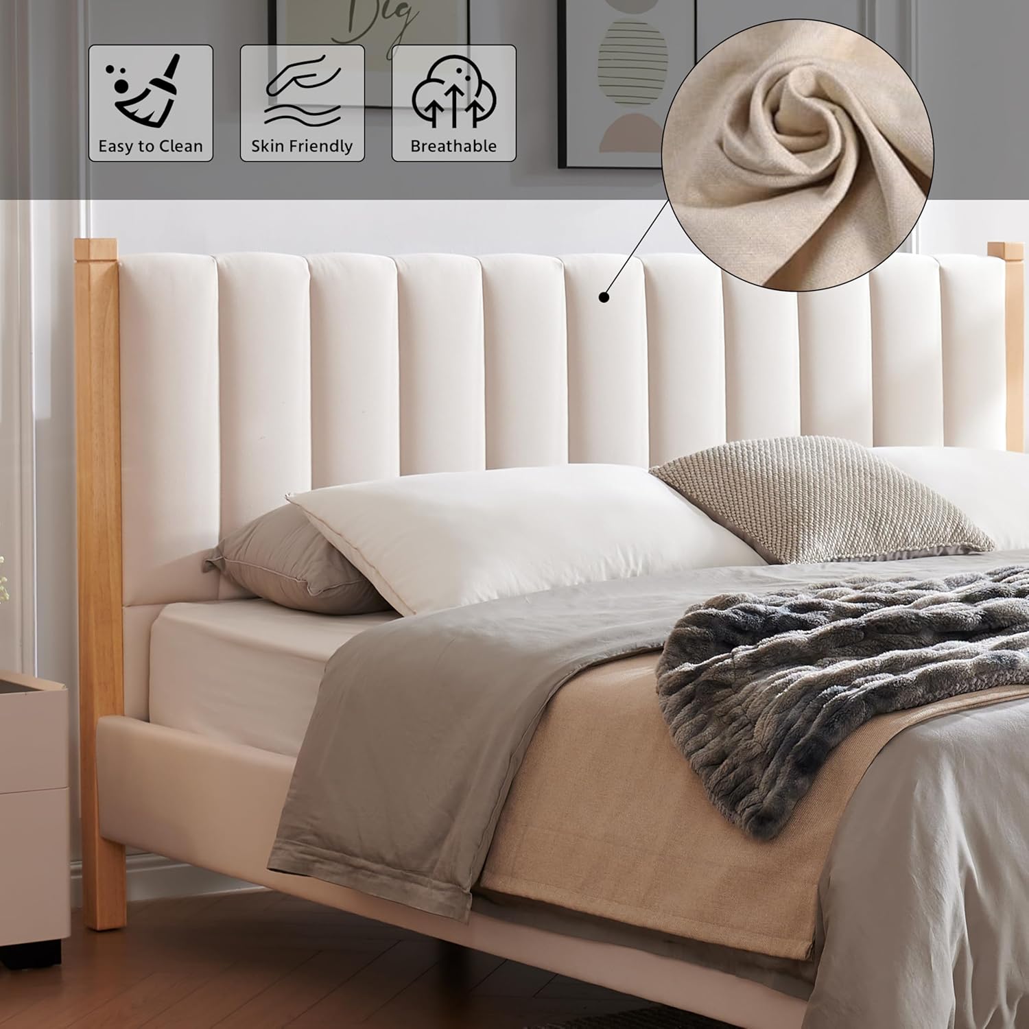 King Size Upholstered Bed Frame, Piano Key-Inspired Headboard, Linen Fabric, 4 Solid Wood Legs, Sturdy Metal & Wood Slats Construction, No Box Spring Needed, Easy Assembly, Beige
