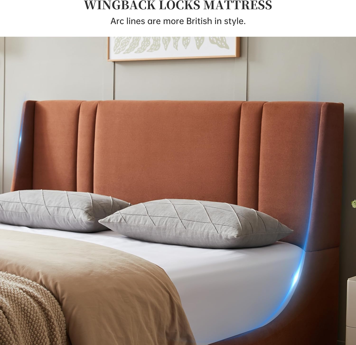 Queen Size Velvet Lift Up Storage Bed, Modern Wingback Headboard, Upholstered Platform Bed with Hydraulic Support, Metal Frame & Wood Slats, No Box Spring Needed, Easy Assembly, Ocher